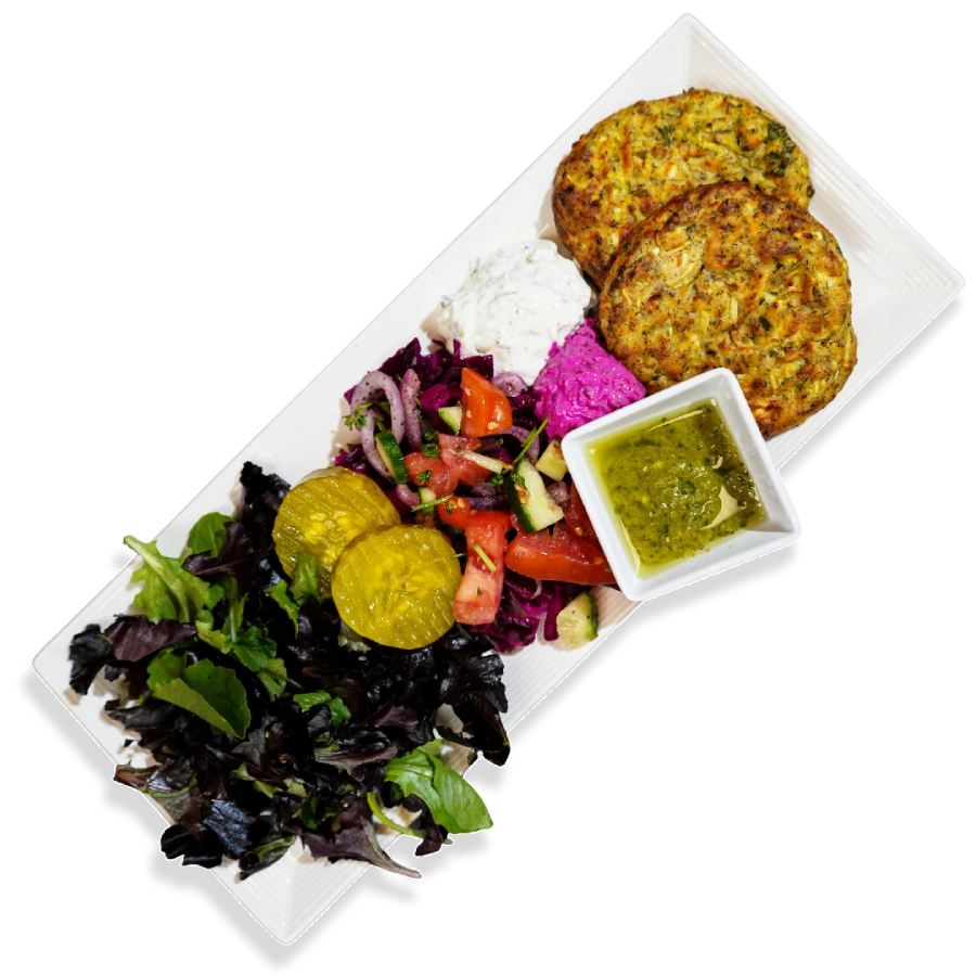 Our house-made mücver crafted with zucchini, carrots, leeks, feta, and herbs. Served with mixed greens, red cabbage, banana peppers, pink sultan, tzatziki, and Green Basil sauce.